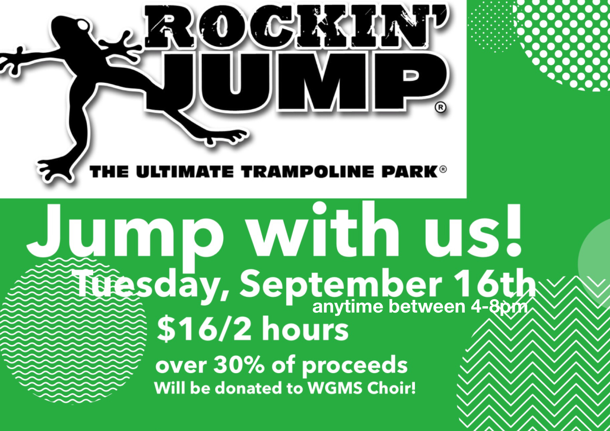 Be sure to mention that you are there for the WGMS Choir. They will receive 30% of the proceeds.